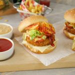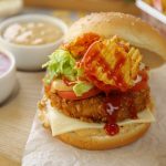 -On a burger bun,add & spread prepared fusion burger sauce,add cheddar cheese slice,fried crispy chicken patty,tomato slices,prepared fusion burger sauce,iceberg,chips,tomato ketchup & top with another burger bun.
