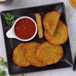 -Place round mold (3 inches) over baking paper,add potato mixture (70g),press gently & make in oval shape with the help of hands (makes 8).