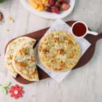 -On a pita/shawarma bread,add & spread pizza sauce,cooked chicken topping,capsicum,corn kernels,onion,cheddar cheese,mozzarella cheese & dried oregano.