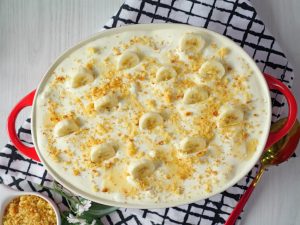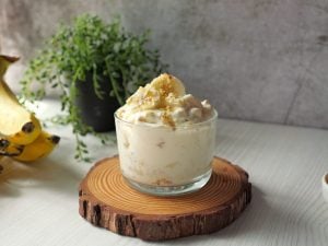 -Pour half quantity in a serving dish & spread evenly,add cake pieces,banana slices,add prepared mixture,cake pieces,banana slices & remaining mixture on top.