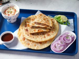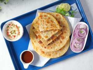 -Heat griddle & fry paratha on medium flame from both sides with clarified butter (makes 5) & serve!