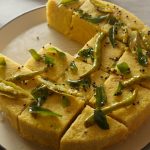 Now invert the dhokla on a plate and remove the pan.