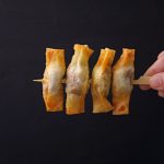 -Cut roll sheets (3x3 inches),add prepared chicken mixture (1 tsp),apply flour slurry & fold in candy shape.