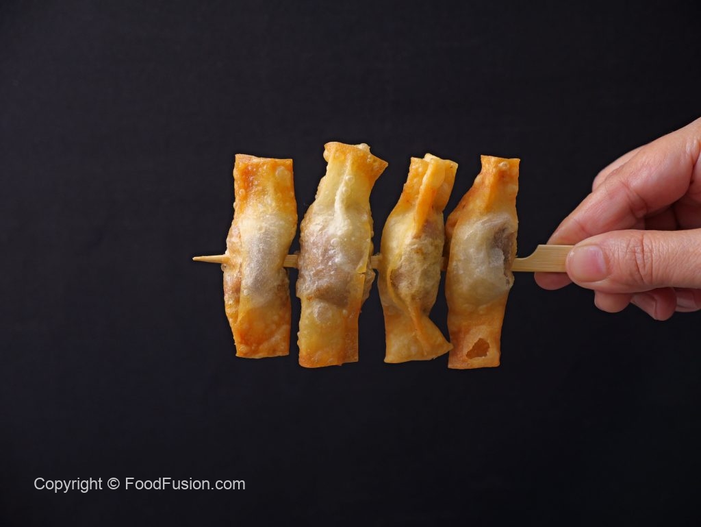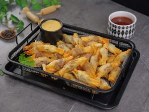-Cut roll sheets (3x3 inches),add prepared chicken mixture (1 tsp),apply flour slurry & fold in candy shape.