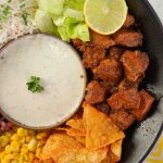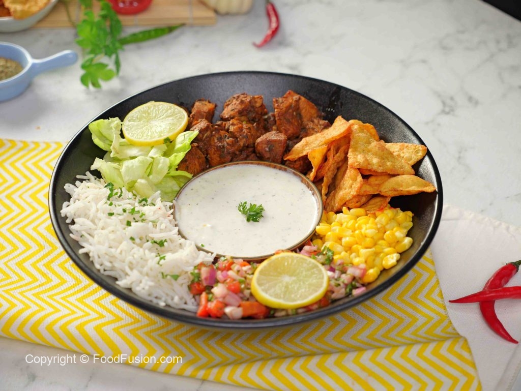 -In a serving dish, place a small bowl in the center, add yogurt sauce in the bowl, add prepared chipotle chicken, boiled rice, prepared tomato salsa, sweet corn, tortilla chips, ice-berg & serve!