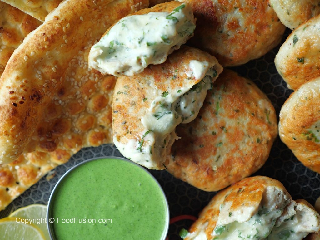 -Grease hands with cooking oil,take 70g of chicken mixture,flatten it,add cheese filling (1 tbs) & cover properly to make a kabab (makes 12).