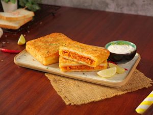 -Add prepared chicken tikka mixture, spread it, cover with another bread slice, press with spatula.