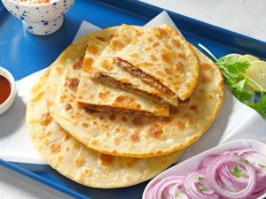 Take wanton wrap,add 1 tbs mixture in the center,apply egg at the edges,fold in triangular shape & seal all sides.