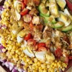 -On a bed of lettuce leaves,add onion,corn kernels,cherry tomatoes,grilled chicken,iceberg,avocado, boiled eggs,pour prepared salad dressing & serve!