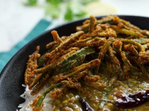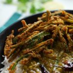 -In a serving bowl,add boiled rice,prepared daal,crispy bhindi,kachumar raita,achar & serve!