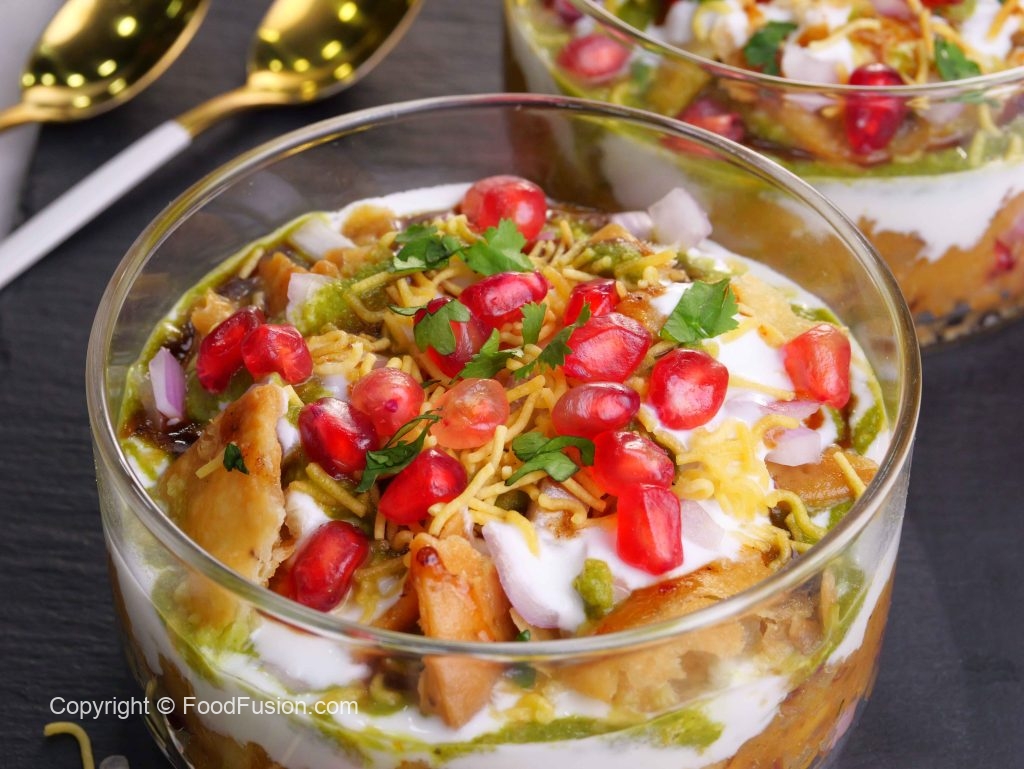 -In a serving bowl or cup, add crushed papri, prepared potato mixture, whisked yogurt, prepared green chutney, sweet tamarind chutney, crushed papri, onion.