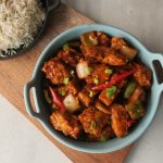 In a wok,heat cooking oil & fry marinated fish pieces on medium flame until crispy & golden brown & set aside.