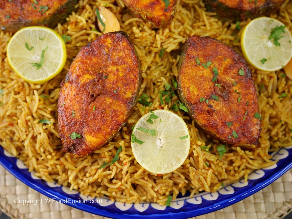 -Serving platter mein mandi rice dalein, upar baked fish rakh den.