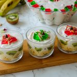 Decorate serving glass with banana and kiwi slices,add fruit cream and garnish with red jelly,almonds.
