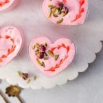-In a serving cup,add prepared rose cream,pistachios,almonds,syrup coated pheni & spread evenly then add prepared rose cream & garnish with rose syrup,pistachios & dried rose buds (makes 8-9).