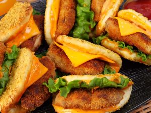 -Buns par prepared sauce spread karein, salad leaf rakhein, crispy chicken, cheese slice aur phir thoda aur sauce daal kar serve karein (makes 14).