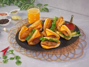 -On buns,add & spread prepared sauce, place salad leaf,crispy chicken,cheese slice,prepared sauce & serve (makes 14).