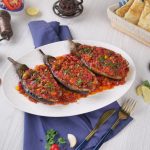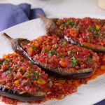-Peel eggplants alternatively from the skin lengthways & prick with fork (don’t remove the head).