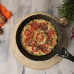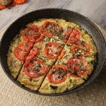 -Poke holes with the help of wooden skewers,place tomato slices,add & spread whisked eggs over it.