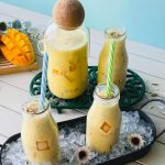 Serving bottle mein mango jelly cubes,tayyar doodh aur badam dal dein.