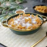 -In a serving dish,add soaked phulki,prepared meethi dahi,sprinkle chaat masala,garnish with papri & serve!