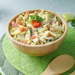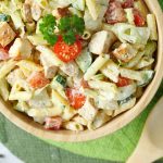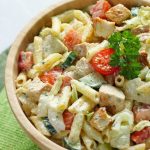 -Bowl mein penne pasta,grilled chicken,kheera,tamatar aur iceberg dal ker ache tarhan toss ker lein.