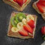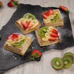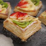 -On a clean working surface,dust dry flour,place puff pastry,sprinkle dry flour & roll out with the help of rolling pin in rectangular or square shape then cut the puff pastry into ½ inch strips & set aside.
