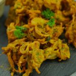 In wok,heat cooking oil and fry onion pakora on low flame until golden brown.
