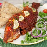 -On a griddle,add cooking oil,marinated fish & cook on low flame from both sides (4 minutes each side) & apply remaining marinade with the help of brush.