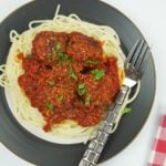 Add spaghetti in a platter, pouring sauce and meatballs and finally sprinkling cheese of your choice and coriander.