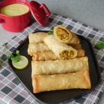 Take samosa sheet,add prepared filling,fold over the sides,roll up and apply all-purpose flour paste.