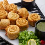 -On roll sheets add prepared filling & spread it evenly along the length,fold & seal with the help of flour slurry then fold it into a pinwheel shape & seal with flour slurry.
