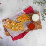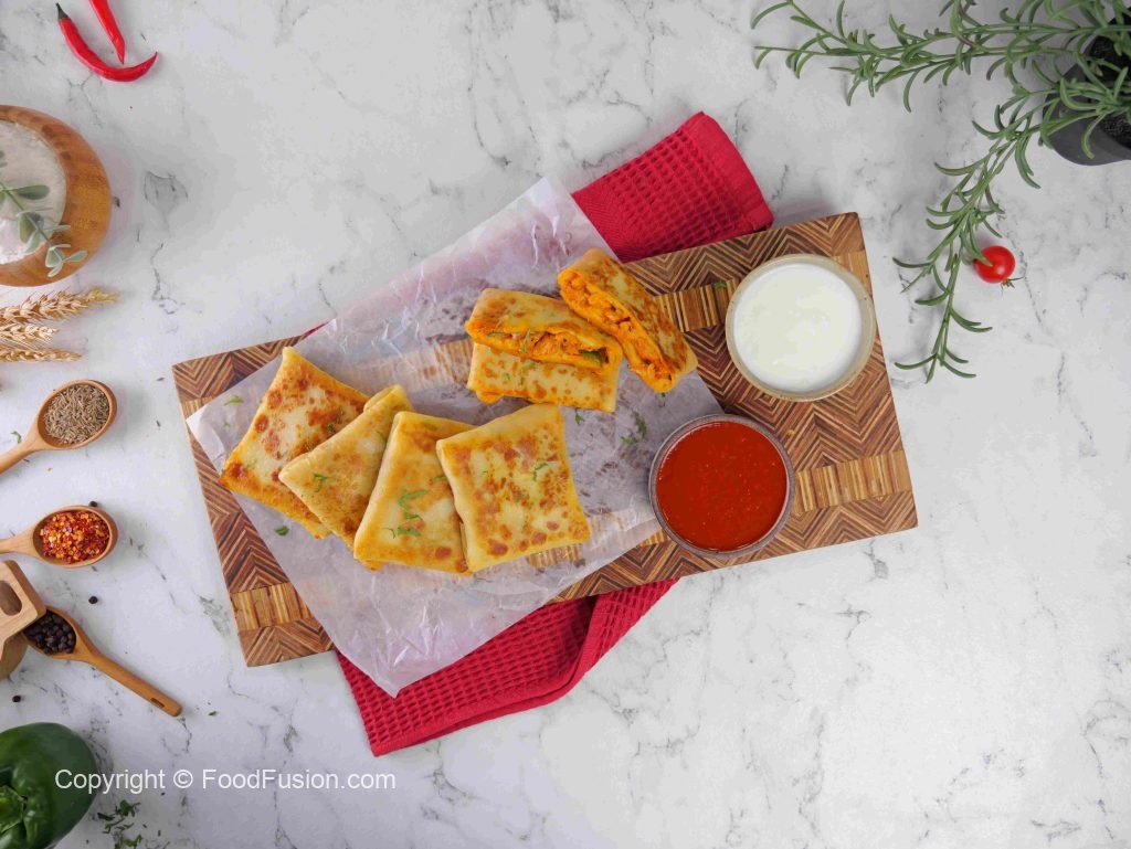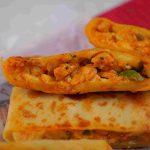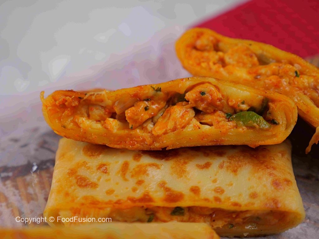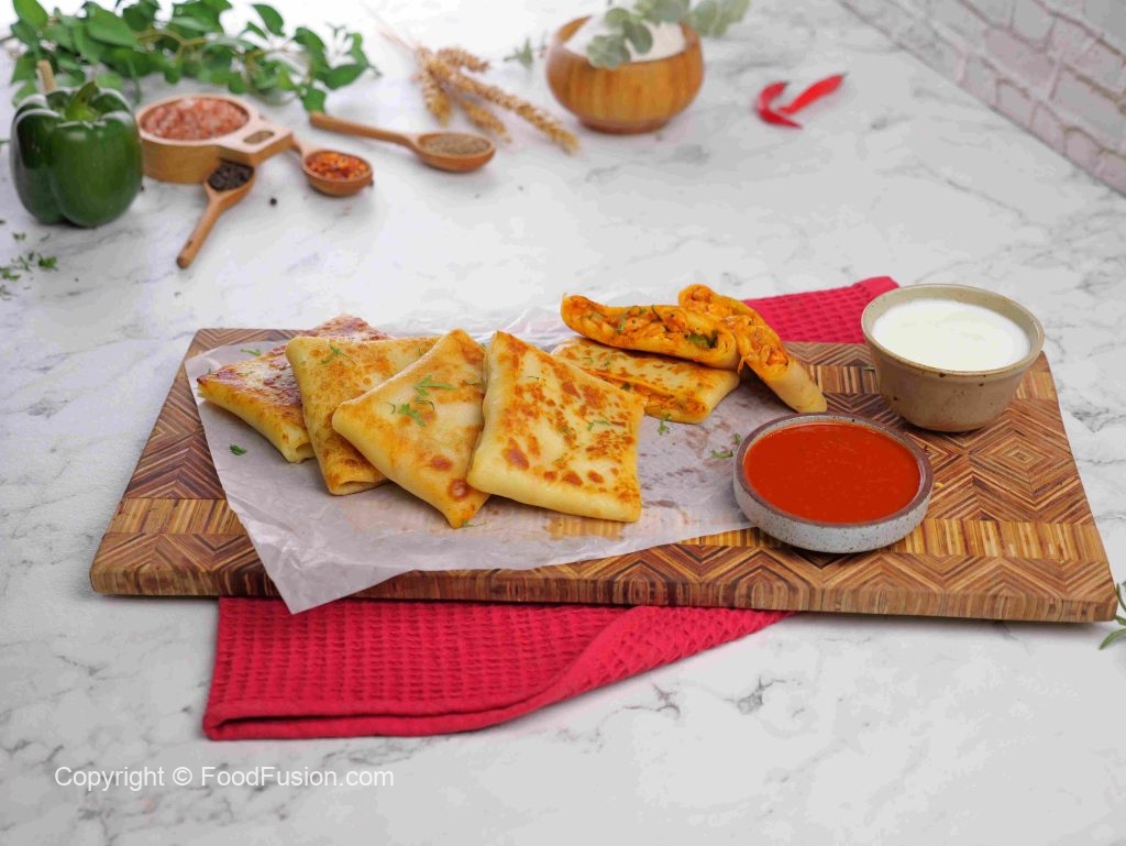 -Place 1 crepe on the cutting board, add cheddar & Mozzarella cheese, prepared chicken filling, more cheese, apply slurry, fold the corners, stuff filling inside & seal it properly.