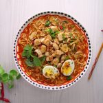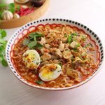 -Add cooked chicken,spring onion,thai red chilli,fresh basil leaves,boiled egg,chilli oil,sesame seeds & serve!
