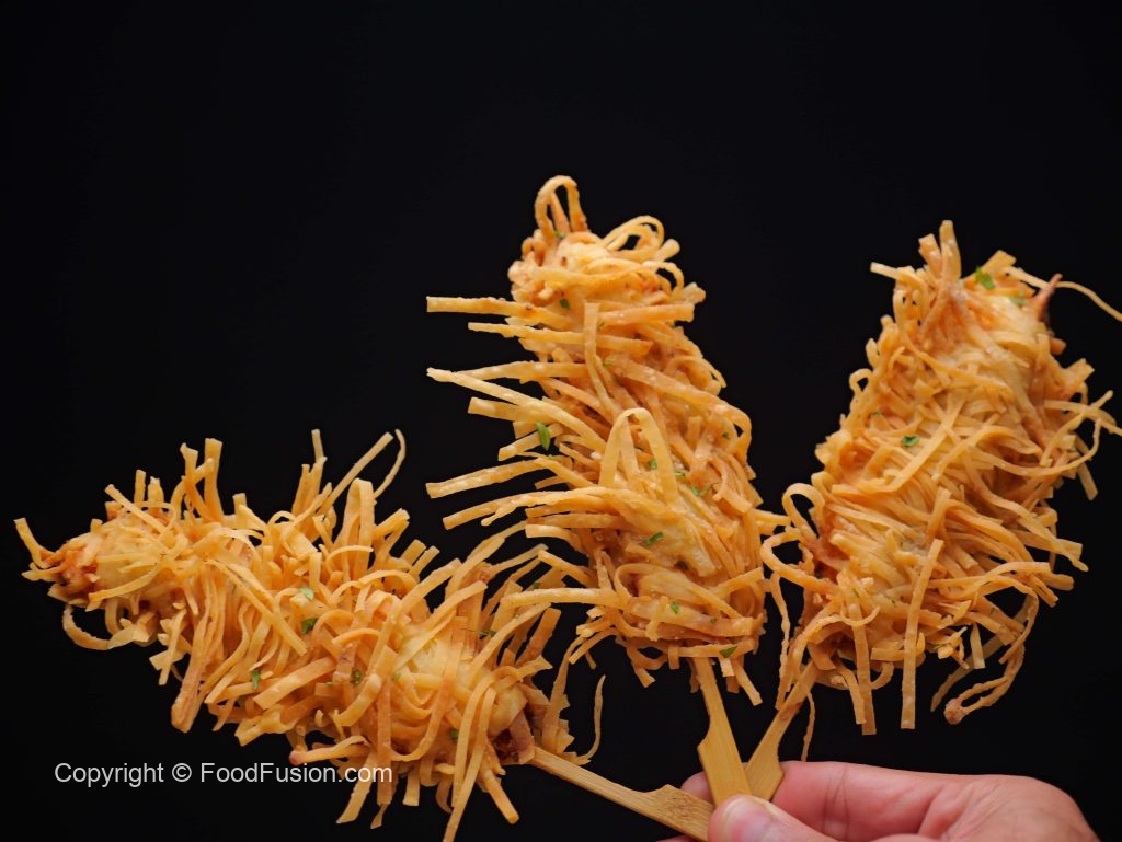 -Coat chicken sticks with roll sheets threads then press to flatten strips properly & set gently and let them rest for 10-15 minutes (makes 11-12).