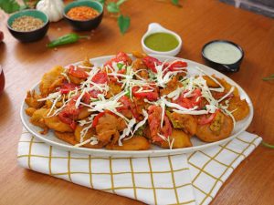 -In a serving platter, add fried pakoray, fried tomato & green chilli slices, pickle, garnish with cabbage & serve!