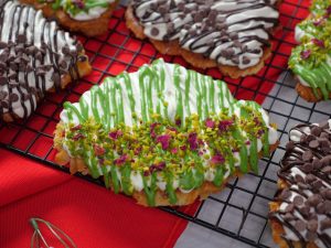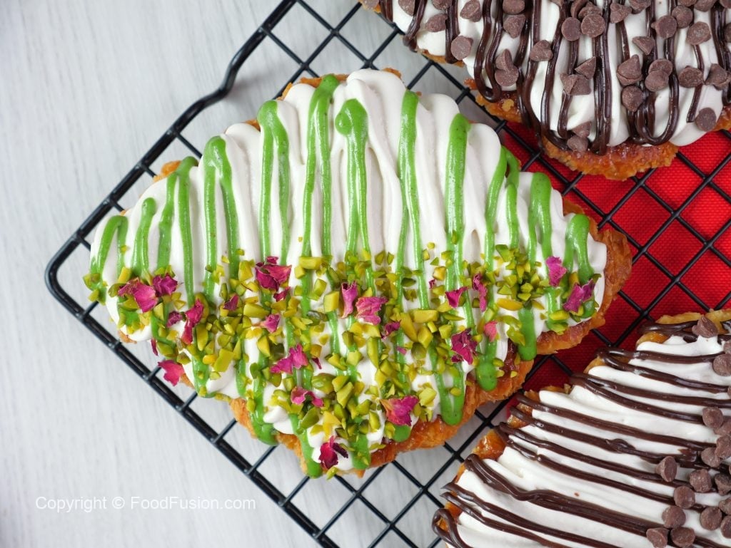 -On a croissant,add & spread cream frosting,pistachio ganache,pistachios & garnish with dry rose petals (makes 6).