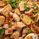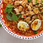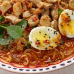 -Add cooked chicken,spring onion,thai red chilli,fresh basil leaves,boiled egg,chilli oil,sesame seeds & serve!