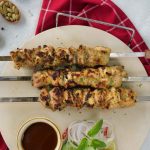 -Chicken pieces ko metal skewers mein lagayein (5 skewers bana lein).