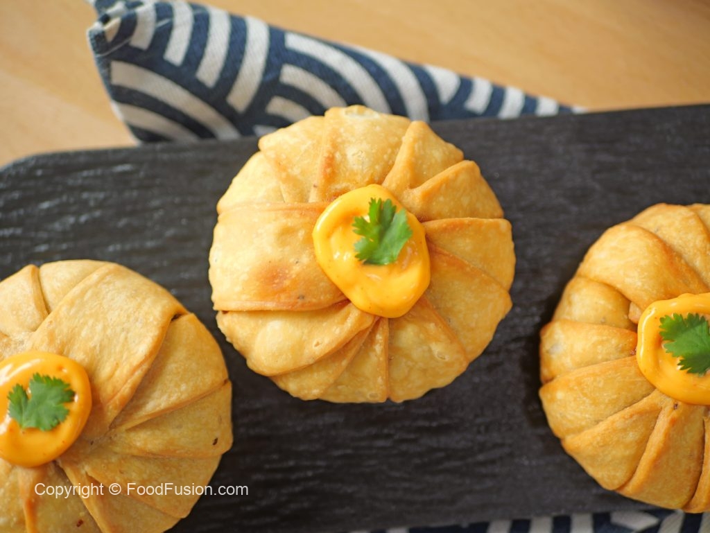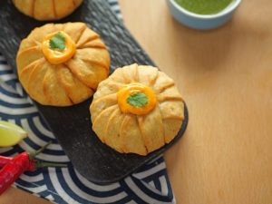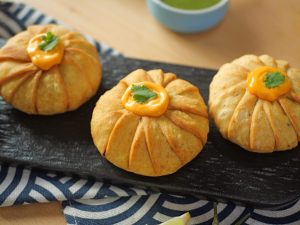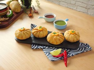 -Roll out with the help of a rolling pin (5 inches), add potato filling (3-4 tbs), make cuts & wrap dough strips over potato filling & make potli shape samosa, apply slurry to seal it. (Makes 9-10)