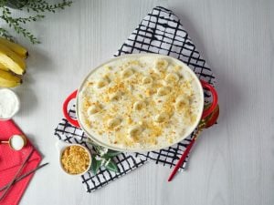 -Pour half quantity in a serving dish & spread evenly,add cake pieces,banana slices,add prepared mixture,cake pieces,banana slices & remaining mixture on top.