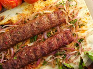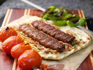 -Dip your hand in ice cold water and take meat mixture and shape the kabab on skewer (Makes 10-12) & let them rest for 30 minutes, then grill until done flip in between.