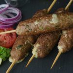 Grease hands with corn oil,take mince mixture and spread on your palm,place skewer and make seekh kabab of equal sizes (makes 10-12).