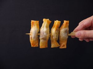 -Cut roll sheets (3x3 inches),add prepared chicken mixture (1 tsp),apply flour slurry & fold in candy shape.
