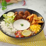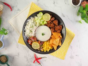 -In a serving dish, place a small bowl in the center, add yogurt sauce in the bowl, add prepared chipotle chicken, boiled rice, prepared tomato salsa, sweet corn, tortilla chips, ice-berg & serve!