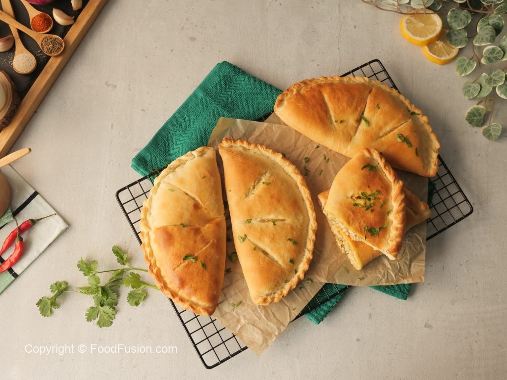 -Baking tray (greased with cooking oil and lined with butter paper) per rolled dough rakh dein,dough ki ek side per chicken filling dal dein,edges per pani laga lein aur dosri side ko fold ker lein,press ker ka pani laga lein aur edges ko seal ker lein.