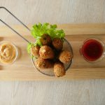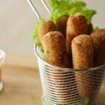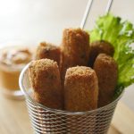 Now coat sticks in all-purpose flour,dip into beaten eggs and coat in bread crumbs,again dip into beaten eggs then coat in bread crumbs.