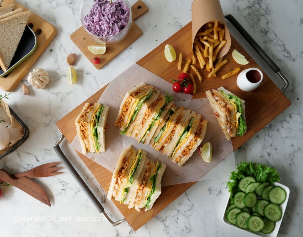 Spread mayonnaise and tomato ketchup,place lettuce leaves,cucumber,prepared omelet,cheese slices & place another bread slice on top.
