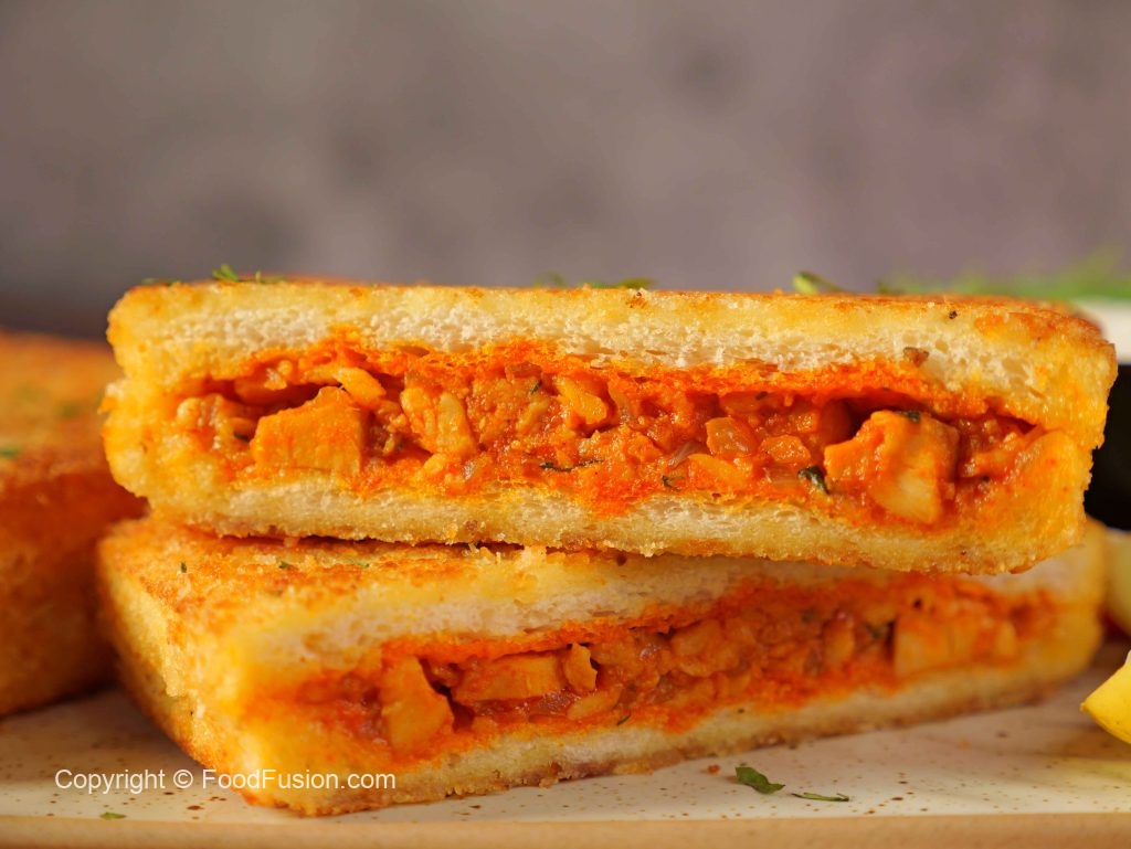 -Add prepared chicken tikka mixture, spread it, cover with another bread slice, press with spatula.