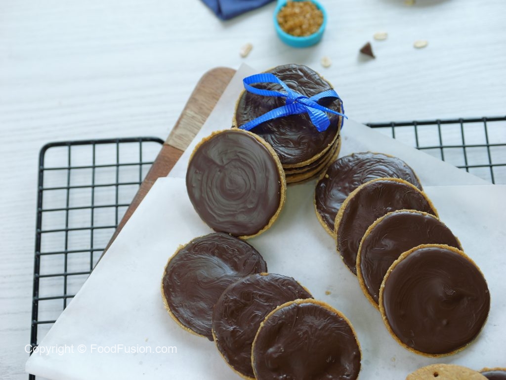 -Biscuits ki ek side per melted chocolate laga lein aur room temperature per set ho janay tak chor dein (makes 28).